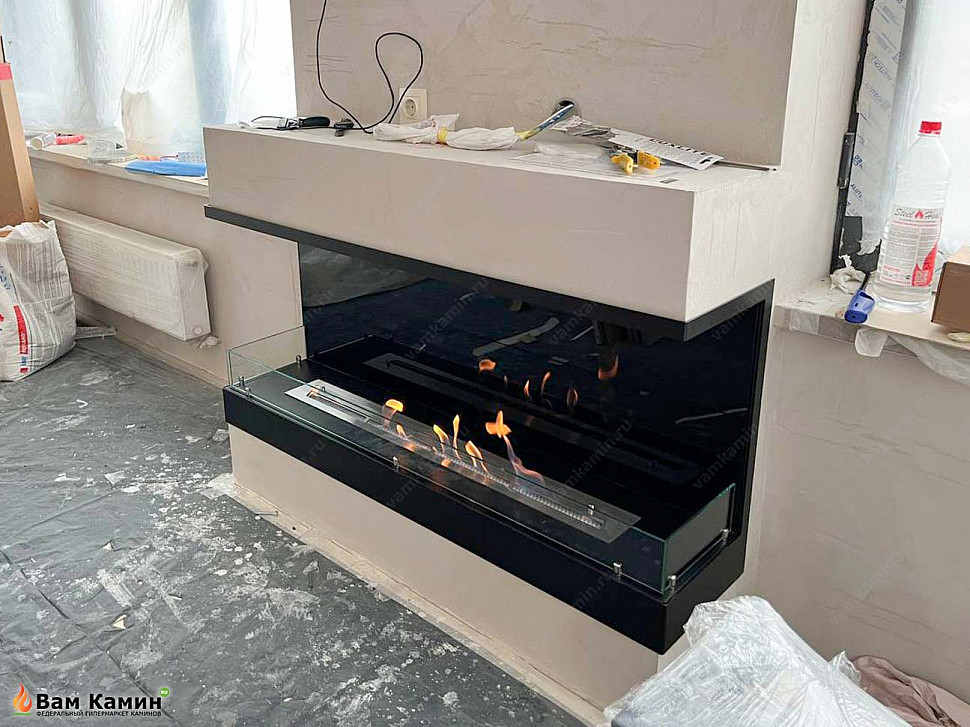 Такой экокамин создавался по индивидуальному заказу. В его основе лежит модель “биокамин фронтальный SteelHeat Leader 1300”. Только под нишу по желанию клиента были изменены габариты фронтального биокамина. Его общая длина равна 1320 мм, с величиной топливного блока в 1000 мм. Линия огня занимает 90 см, что позволяет считать такой биокамин хорошим дополнительным источником тепла.