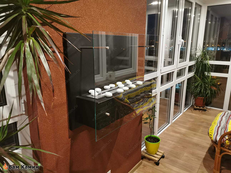 На топливном блоке этой модели хозяева расположили эстетичные керамические камни для биокамина. В результате на стене балкона биокамин AMBER смотрится интересно и задает стиль всему помещению.