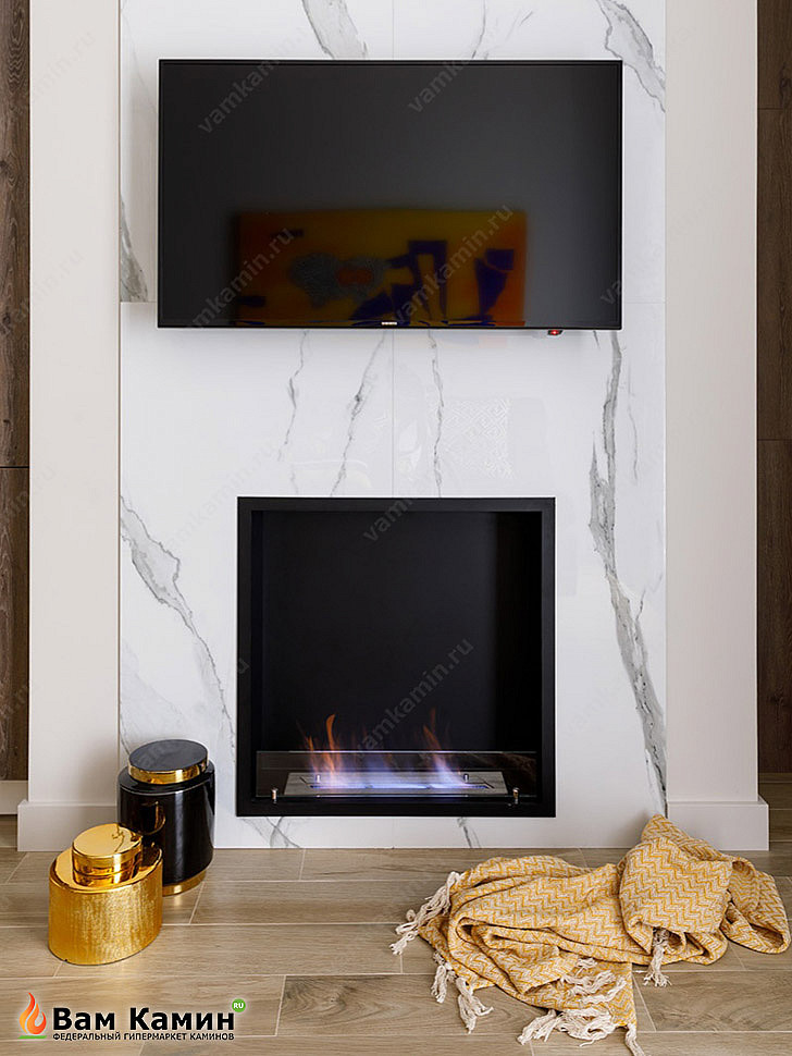 Посмотрите, как элегантно смотрится биокамин в нише с отделкой из плит мрамора. С точки зрения дизайна экокамин черного цвета работает в визуальном тандеме с темным ТВ-экраном на фоне светлых плит из благородной каменной облицовки.