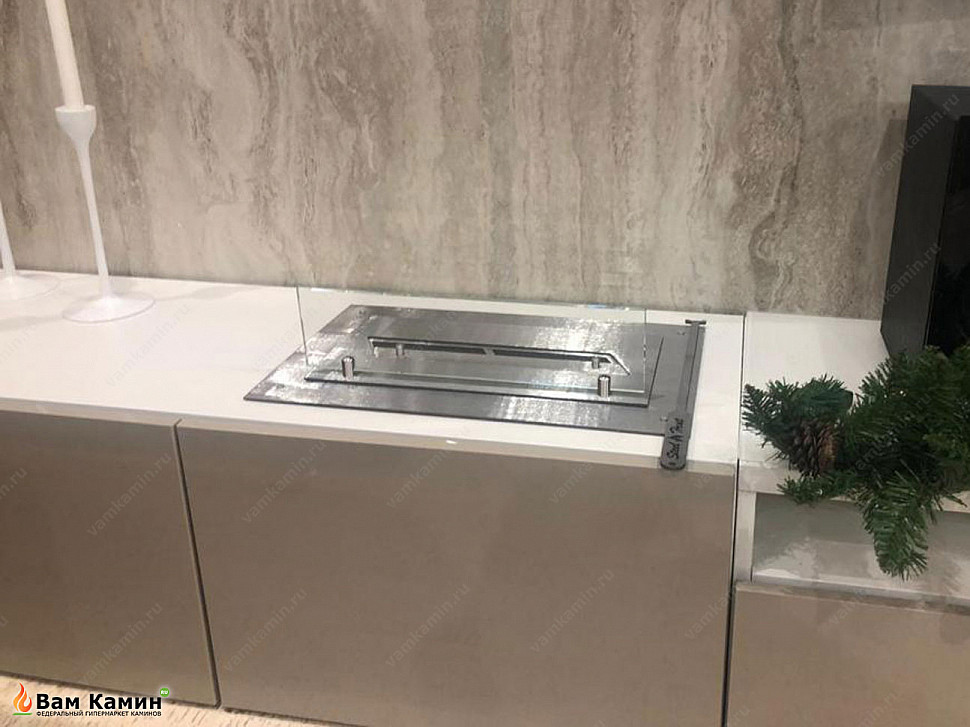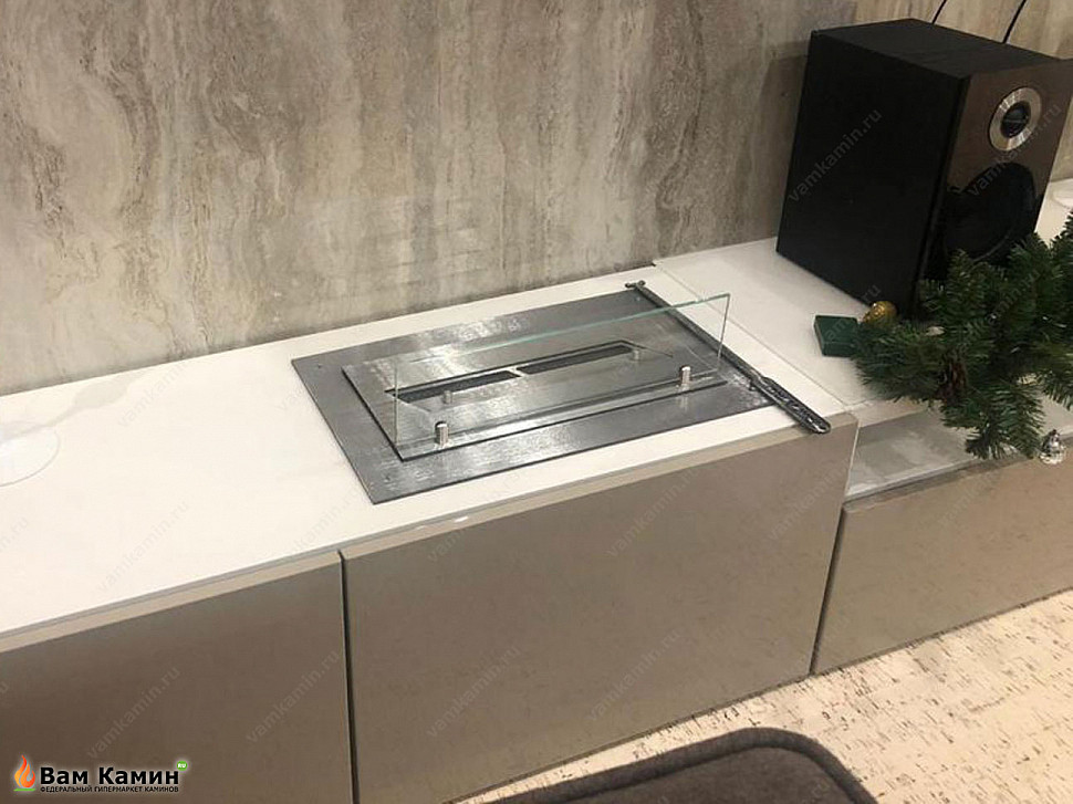 В данном случае фото демонстрирует встроенный в мебель топливный блок. Это топливный блок SteelHeat LINE GLASS. Его особенность - экран из закаленного стекла. Такое стекло выполняет защитную функцию и в то же время выглядит стильно.